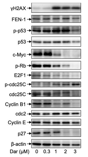 Given a close correlation between cell cycle arrest and chemotherapeutic drug-mediated DNA damage, the expression of γH2AX, a DNA damage marker [35,36], was first evaluated in NB4 cells following exposure to 0.3, 1, 2, and 3 μM darinaparsin for 24 h. As shown in Figure 7 and Figure 8, the expression level of γH2AX was dramatically upregulated in the cells treated with darinaparsin at a concentration equal to or greater than 1 μM, although there was only a slight increase in its expression when treated with 0.3 μM darinaparsin. By contrast, a small but significant increase in the expression of flap endonuclease 1 (FEN1), known as an important factor in DNA damage repair [35,37], was observed only in the cells treated with relatively high concentrations of darinaparsin (2 and 3 μM). Transcription factors p53 and c-Myc are known to be involved in regulating proliferation and apoptosis induction [20,21,38]. In parallel with the dramatic upregulation of γH2AX, a substantial and significant increase in the expression levels of phosphorylated p53 (p-p53) over the endogenous levels was observed in the cells treated with darinaparsin even at the concentration as low as 0.3 μM, indicating p53 activation. Interestingly, the degree of p53 activation almost returned to control level when treated with a relatively high concentration of 3 μM, indicating that a transient increase in its activation might be required for the action of darinaparsin. Additionally, darinaparsin induced a remarkable decrease in the expression level of c-Myc in a dose-dependent manner. Retinoblastoma (Rb) tumor suppressor protein is known to be regulated by c-Myc and closely related to cell cycle regulation and apoptosis induction [39,40]. In this regard, treatment with darinaparsin caused a dose-dependent reduction in the expression of phosphorylated Rb (p-Rb), the inactive form of Rb, indicating the activation of Rb. The expression level of E2F1, a downstream target of Rb action [39,40], was concomitantly downregulated in a similar manner, indicating the inactivation of E2F1.