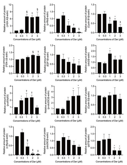 Alteration of expression level of cell cycle arrest-related proteins in NB4 cells treated with darinaparsin. Following treatment with various concentrations of darinaparsin (0.3, 1, 2 and 3 µM) for 24 h, the alteration of expression levels of cell cycle arrest-related proteins was analyzed according to the Western blot images shown in Figure 7. The densitometry of protein bands was analyzed using a program, NIH ImageJ 1.53k. The relative expression levels were expressed as the ratios between each key gene protein and β-actin protein expression levels and compared with those of the untreated control group. Results are shown as the means ± SD from three independent experiments. *, p < 0.05; †, p < 0.01; §, p < 0.001; ‡, p < 0.0001 vs. control. Dar, darinaparsin; p-p53, phosphorylated p53; p-Rb, phosphorylated Rb; p-cdc25C, phosphorylated cdc25C.