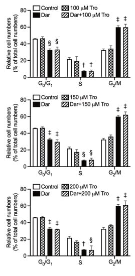 Effect of Trolox on cell cycle profiling in NB4 cells treated with darinaparsin. After treatment for 6 h with 1 μM darinaparsin in the presence or absence of 100, 150 and 200 μM Trolox, cell cycle analysis was performed as described in the legend of Figure 6. Quantification of the percentages of cells at the G0/G1, S and G2/M phase fractions are shown. Results are shown as the means ± SD from more than three independent experiments. †, p < 0.01; §, p < 0.001; ‡, p < 0.0001 vs. control. Dar, darinaparsin; Tro, Trolox.
