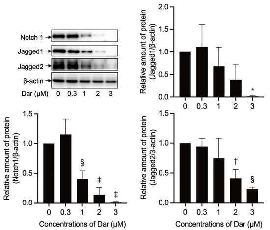 Effect of darinaparsin on Notch1 signaling-related gene protein expression. Following treatment with various concentrations of darinaparsin (0.3, 1, 2 and 3 µM) for 24 h, the alteration of expression levels of Notch1 signaling-related proteins was analyzed using Western blot. Representative images of the expression profiles of each protein are shown from three independent experiments. The relative expression levels are expressed as the ratios between each gene protein and β-actin protein expression levels and are compared with those of untreated control group. Results are shown as the means ± SD from three independent experiments. *, p < 0.05; †, p < 0.01; §, p < 0.001; ‡, p < 0.0001 vs. control. Dar, darinaparsin. The images of beta-actin are identical to those in Figure 3D because the same experiment samples were used for analysis.