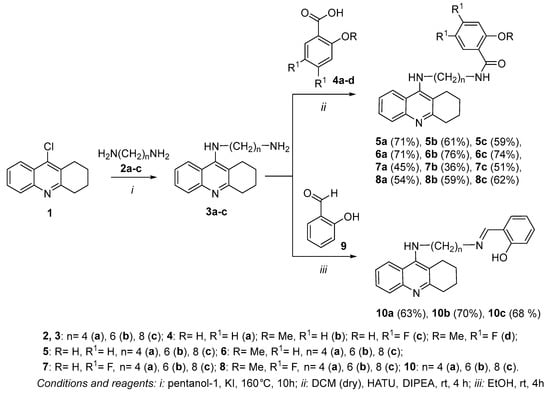 - Spilovska, K.; Korabecny, J.; Nepovimova, E.; Dolezal, R.; Mezeiova, E.; Soukup, O.; Kuca, K. Multitarget tacrine hybrids with neuroprotective properties to confront Alzheimer’s disease. Curr. Top. Med. Chem. 2017, 17, 1006–1026. [Google Scholar] [CrossRef]