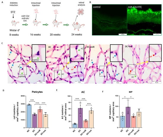 Effects of miR-124 on pericyte loss and AC formation in diabetic rat retinae. (A) Schema of animal experiments. According to the diabetes-induction and miR-124 injection, the animals are divided into four groups: non-diabetic control (NC), diabetes (DC), diabetes treated with miR-124 (DC+miR), or diabetes treated with miR-124 inhibitor (DC+inh). (B) Images of green fluorescence from the eyes injected with 25 pmol of miR-124-FITC (right) or with solvent as control (left) after 3 h. Images were taken with Olympus BX51 microscope, scale bar = 100 µm. (C) Representative images of PAS and hematoxylin-stained retinal digestion preparation of rats from control and experimental groups. Images were taken with Olympus BX51 microscope. AC: acellular capillary, MP: migrating pericyte, p: pericyte; scale bar = 50 µm. (D–F) Quantification of pericytes (number of pericytes/mm2 capillary area) (D); of acellular capillaries (number of AC/mm2 retinal area) (E); of migrating pericytes (number of MP/mm2 capillary area) (F) were analyzed using CellF software version 5.1 from Olympus. n = 5, * p < 0.05, *** p < 0.001 (one-way ANOVA with Tukey’s multiple comparisons test).