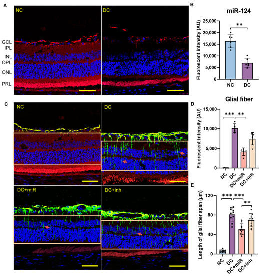 Glial activation is well appreciated in DR. To determine the effect of miR-124 on glial activation in the diabetic retina, ISH of miR-124 combined with immunofluorescent staining of GFAP was performed. GFAP was moderately expressed in astrocytes in the GCL of non-diabetic control retinae (Figure 2C, NC), whereas, in diabetic retinae, it was expressed more strongly in astrocytes in GCL and newly detected in Müller glia radial fibers (Figure 2C, DC). The enhanced fluorescent intensity of GFAP in Müller glia fibers (Figure 2D) and the increased length of the endfeet of Müller glia down to the deep retinal layer (Figure 2E) indicate the strong activation of Müller glia in diabetic retinae. Delivery of miR-124 into diabetic eyes left GFAP levels in astrocytes unchanged. In contrast, the fluorescent signals in Müller glia fibers were significantly inhibited (58% reduction, DC+miR vs. DC, p < 0.01, Figure 2C,D), and the length of the endfeet down to the deep capillary layer was significantly decreased (37% reduction, DC+miR vs. DC, p < 0.001, Figure 2C,E). The diabetic rats injected with the miR-124 inhibitor (miR-inh) did not show an inhibitory effect on GFAP expression. Altogether, these results indicate that miR-124 is able to reduce Müller glial activation under hyperglycemic conditions.