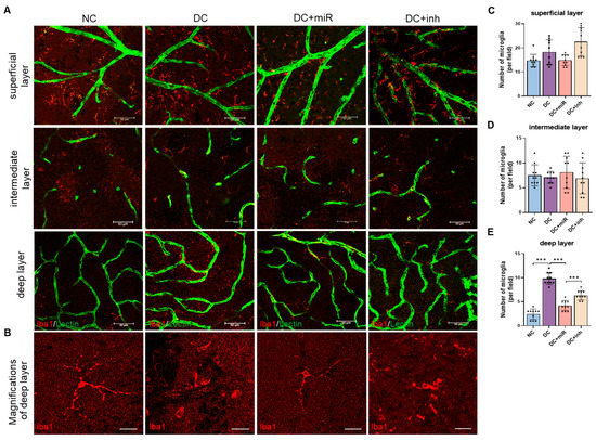 miR-124 normalized deep layer microglial activation in diabetic retinae. (A) Representative images of co-immunofluorescent staining of Iba1 (red) and Lectin (green) in the whole mount retinae from non-diabetic control (NC) rats, diabetic rats (DC), DC treated with miR-124 (DC+miR), or DC treated with miR-124 inhibitor (DC+inh) in superficial, intermediate, and deep vascular layer. The images were taken with the Leica confocal microscope SP8, scale bar = 50 µm. (B) The representative images of magnifications of Iba1 staining in the deep layer. Scale bar = 20 µm. (C–E) Quantification of microglia in the superficial layers (C), intermediate layers (D), and deep layers (E) of rat retinae. The quantification of microglial numbers was exhibited as mean ± SD, n = 10, *** p < 0.001 (one-way ANOVA with Tukey’s multiple comparisons test).