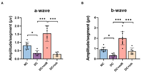 Effects of miR-124 on neuroretinal functions of diabetic rats. (A) Averaged values of a-wave amplitudes and (B) b-wave amplitudes measured by mfERG on rats at week 24 in four experimental groups: non-diabetic control (NC), diabetic control (DC), diabetic rats treated with miR-124 (DC+miR) or with its inhibitor (DC+inh). Data are presented as mean ± SD, n = 6–8. p values were determined by one-way ANOVA with Tukey’s multiple comparisons test, * p < 0.05, *** p < 0.001.