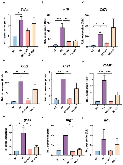 To assess the effect of miR-124 on microglia inflammatory response in persistent hyperglycemic conditions, we examined the expression of inflammation-associated genes in the retinae of NC, DC, DC+miR, and DC+inh rats using quantitative RT-PCR. In contrast to the expression in NC, a large range of inflammatory molecules were notably enhanced in DC retinae, including cytokines (Tnf-α, Il-1β), CD74 molecule (Cd74), chemokines (Ccl2, Ccl3), vascular cell adhesion protein 1 (Vcam1), Tgf-β1, Arg1, and Il-10 (Figure 5). Importantly, the elevated expression of these genes was specifically inhibited by the introduction of miR-124, which demonstrates the inhibitory effects of miR-124 in the inflammatory responses of microglia in diabetic conditions.