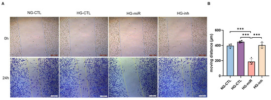 Effect of miR-124 on microglia mobility in high glucose conditions. (A) Representative images of WHA performed with high glucose (4.5 g/L)-treated BV2 cells which were transfected with control miRNA (HG-CTL), or miR-124 mimic (HG-miR) or miR-124 inhibitor (HG-inh) for 24 h. Cells cultured in normal glucose medium and transfected with control miRNA were used as control (NG-CTL). At the endpoint, cells were fixed in methanol and stained with Giemsa. The images at the time point of 0 h (upper panel) and 24 h (low panel) were taken with the Leica DMIRB light microscope, scale bar = 200 µm. (B) Quantification of the moving distances calculated from the gap sizes measured at 0 h and 24 h, 10 random measurements of each image, 4 images from each group. Data are shown as mean ± SD, n = 4, *** p < 0.001 (one-way ANOVA with Tukey’s multiple comparisons test).