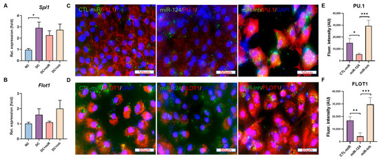 Downregulation of PU.1 and Flot1 by miR-124. (A,B) The relative expression of gene Spi1 (A) and Flot1 (B) in the rat retinae of non-diabetic controls (NC), diabetic controls (DC), DC treated with miR-124 (DC+miR) or its inhibitor (DC+inh) measured by quantitative RT-PCR. (C,D) Immunocytochemistry (ICC) of PU.1 (C) and FLOT1 (D) in primary rat microglial cells transfected with control miRNA (CTL-miR), miR-124 mimic (miR-124), or miR-124 inhibitor (miR-inh). PU.1 and FLOT1 were detected using Alexa Fluor 555 labeled secondary antibody (red), miRNA localization was visualized by FITC (green) due to its fluorescein-labeled form, and cell nuclei were labeled with DRAQ5TM (blue). Images were taken with the Leica confocal microscope SP8, scale bar = 50 µm. (E,F) Quantification of ICC immunofluorescence of PU.1 (E) and FLOT1 (F) using Image J/Fiji software. Data are exhibited as mean ± SD, n = 5, * p < 0.05, ** p < 0.01, *** p < 0.001 (one-way ANOVA with Tukey’s multiple comparisons test).