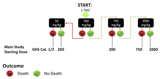 Flowchart for the starting dose selection. When no data were available, we administered a single dose of 200 mg/kg to 1 TMC, increasing or decreasing the dose on the basis of obtained results. GHS cat.: Globally Harmonized System category.