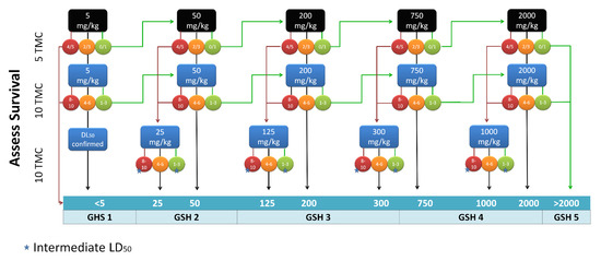 Flowchart for LD50 determination. Starting from the opportune initial dose, LD50 was determined by changing the dose based on results and increasing the number of TML for final determinations. GHS cat.: Globally Harmonized System category. The numbers on the circles represent the number of deaths in exemplars. The star indicates that if the mortality was not 50%, the experiment was repeated using an intermediate dose.