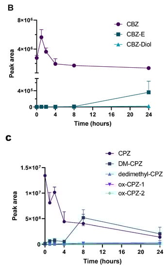Pharmacokinetic plots of furosemide (FUR) panel (A), carbamazepine (CBZ) panel (B) and chlorpromazine (CPZ) panel (C). The analysis of drugs and the corresponding metabolites was performed at different time points (0, 1, 2, 4, 8 and 24 h post-treatment).