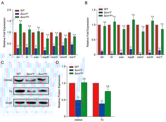 Considering the pivotal importance of LEE islands in EHEC O157:H7 intimate adherence [33,34], whether the effect of UvrY on host adherence is through regulating the LEE islands’ genes was measured. RNA from the WT, ΔuvrY, and ΔuvrY+ strains cultured in DMEM to log phase was extracted and subjected to qRT-PCR analysis. Interestingly, the expression of seven representative LEE genes measured (i.e., ler, tir, eae, espB, escC, escN, and escT) were downregulated in the ΔuvrY strain compared to the WT, but the expression level of the LEE genes between the WT and ΔuvrY+ strains are comparable (Figure 2A), indicating the importance of UvrY in LEE gene expression induction.