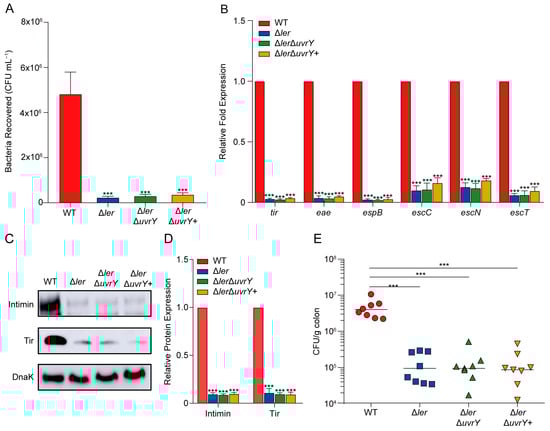 Consistent with the adherence results, reduced LEE gene expression was also detected through qRT-PCR analysis (Figure 3B), as well as the intimin and Tir protein level reduction (Figure 3C,D) in the Δler, ΔlerΔuvrY, and ΔlerΔuvrY+ strains compared with the WT. The results revealed that the cellular adherence capacity effect of UvrY is mediated by Ler. Furthermore, the results were reinforced in vivo through colon colonization experiments in mice. After orally inoculation with the EHEC O157:H7 strains for 6 h, the different ler mutant strains showed an approximately 42-fold lower bacterial load level than the WT-inoculated mice, regardless of whether the uvrY was depleted or complemented (Figure 3E). Collectively, these results demonstrated that UvrY activates LEE expression in a Ler-dependent manner.