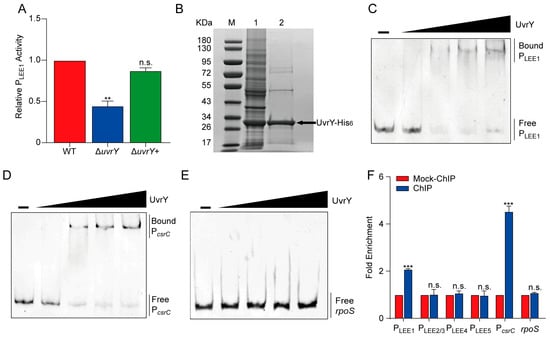 UvrY directly binds to the promoter of the ler. (A) A bar plot showing the LEE1-lux activity in WT, ΔuvrY, and ΔuvrY+ strains, respectively. LEE1-lux activity values in WT were normalized to 1. (B) SDS-PAGE photograph of the purified UvrY-His6. Lane M: protein marker; Lane 1: total protein; Lane 2: purified UvrY-His6 protein. (C–E) Chemiluminescence photographs showing the EMSA result for the binding affinity of protein UvrY-His6 with (C) the ler (LEE1) promoter; PLEE1, (D) csrC promoter; PcsrC, and (E) rpoS coding region. (F) A bar plot showing the relative fold enrichment of the promoter fragments of LEE1, LEE2/3, LEE4, and LEE5 in ChIP samples compared with mock-ChIP samples, measured using q-PCR. PcsrC and rpoS were calculated as a positive or negative control, respectively. Significance was determined using two-tailed unpaired Student’s t-test (A,F). ** represents p ≤ 0.01; *** represents p ≤ 0.001; n.s. represents no significant difference.