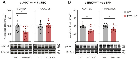 Immunodensities of activated (A) JNK1/2 and (B) ERK1/2 in cortical and thalamic brain tissue samples from WT (grey bars; n = 9) and PDYN-KO (reddish bars; n = 9) mice. Normalized enzyme activation was estimated as the ratio between phosphorylated (i.e., p-Thr183/Tyr185 JNK1/2 or p-Thr202/Tyr204 ERK1/2) to non-phosphorylated protein species. Columns are means ± SEM of each experimental group and expressed in percent change from WT animals for each brain region. * p < 0.05, and ** p < 0.01, Student’s t test. (A,B) Representative immunoblots of cortical and thalamic JNK and ERK phosphorylated and non-phosphorylated species (three different animals per group) are shown at the bottom. The indicated molecular weights (in kDaltons, kD) of the immunoreactive bands were estimated from in-gel-loaded, prestained protein standards.