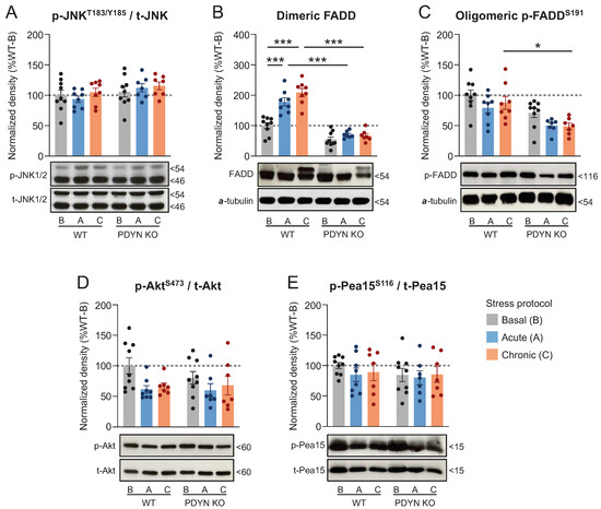 Thalamic immunodensities of (A) activated p-Thr183/Tyr185 JNK1/2, (B) dimeric FADD, (C) oligomeric p-Ser191 FADD, (D) activated p-Ser473 Akt, and (E) p-Ser116 Pea15 in WT and PDYN-KO mice exposed to acute restraint (A, blue bars) or chronic mild (C, orange bars) stress procedures, as compared to basal (B, grey bars) stress levels in undisturbed animals. Normalized protein amounts were estimated as the ratio between the corresponding immunoreactive band to total enzyme or α-tubulin. Columns are means ± SEM of n = 7–9 mice per experimental group and expressed in percent change from wildtype-basal (WT-B) mice. All datasets were analyzed by TW-ANOVA (see Table 1). * p < 0.05, and *** p < 0.001, TW-ANOVA followed by Tukey’s post hoc test. (A–E) Representative immunoblots of phosphorylated and/or non-phosphorylated species of the indicated proteins are shown at the bottom. The indicated molecular weights (in kDaltons, kDa) of the immunoreactive bands were estimated from in-gel-loaded, prestained protein standards.