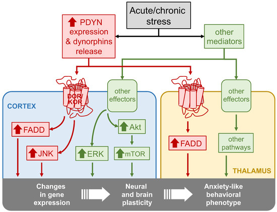 Importantly, the dramatic stress-induced upregulation of two stress-related signaling molecules—JNK1/2 and FADD—observed in the brains of the WT animals did not occur in mice lacking the PDYN gene exposed to the same stress procedures. Of note, we did not assess the effect of the present stress procedures on dynorphin amounts in WT animals. However, stress-induced dynorphin release has been previously demonstrated under multiple types of environmental stressors [56]. Although remote, we should also consider that JNK1/2 and FADD stimulations may be attributed to alternative causes other than stress-induced dynorphin release and the subsequent activation of KOR/DOR. In contrast to JNK1/2 and FADD, ERK and Akt/mTOR cortical hyperactivations were similarly observed in both the WT and PDYN-KO mice, suggesting that the PDYN gene exerts control over select signaling pathways. As PDYN-KO mice are more vulnerable to environmental stressors [11,12], dynorphins and the stimulated downstream pathways may contribute to mitigating the cellular and molecular mechanisms leading to anxiety [1] (Figure 6).