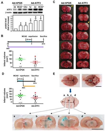 - Ohba, N.; Maeda, M.; Nakagomi, S.; Muraoka, M.; Kiyama, H. Biphasic expression of activating transcription factor-3 in neurons after cerebral infarction. Mol. Brain Res. 2003, 115, 147–156. [Google Scholar] [CrossRef] [PubMed]