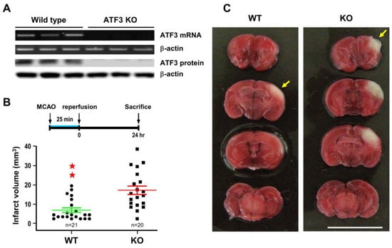 - Wang, L.; Deng, S.; Lu, Y.; Zhang, Y.; Yang, L.; Guan, Y.; Jiang, H.; Li, H. Increased inflammation and brain injury after transient focal cerebral ischemia in activating transcription factor 3 knockout mice. Neuroscience 2012, 220, 100–108. [Google Scholar] [CrossRef] [PubMed]