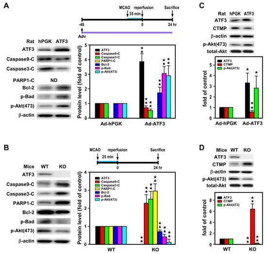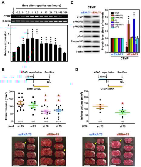 - Huang, C.-Y.; Chen, J.-J.; Wu, J.-S.; Tsai, H.-D.; Lin, H.; Yan, Y.-T.; Hsu, C.Y.; Ho, Y.-S.; Lin, T.-N. Novel Link of Anti-apoptotic ATF3 with Pro-apoptotic CTMP in the Ischemic Brain. Mol. Neurobiol. 2015, 51, 543–557. [Google Scholar] [CrossRef]