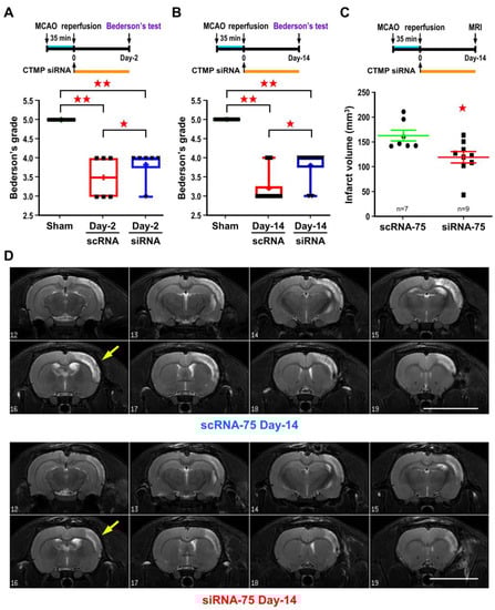 2.4. Post-Ischemic CTMP siRNA Treatment Ameliorates Brain Infarct and Neurological Deficits