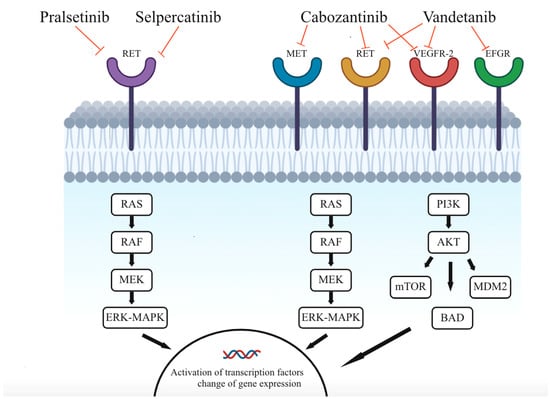 Several oncogenic pathways are known to be present in MTC [14]. An example is the RTK mesenchymal-epithelial transition factor (MET) situated in the epithelial cells of multiple organs and becomes activated when the ligand hepatocyte growth factor (HGF) binds. The intracellular pathways PI3K/mTOR and RAS/MAPK are activated and signal cell survival and cell proliferation. Interference with such cascades can lead to the progression and metastatic spread of MTC [17]. The growth factor (GF) vascular endothelial GF (VEGF) is also of great importance regarding tumorigenesis. Overexpression of VEGF and its corresponding receptor VEGFR-2 is seen during tumorigenesis, partially due to the para- and autocrine secretion from the tumor cell itself. VEGFR-2 is an RTK expressed on epithelial cells in the blood vessels. When activated with VEGF-A, it stimulates vascular permeability and tumor-associated angiogenesis (formation of new blood vessels from pre-existing vessels) and plays a key role in malignant tumor initiation and proliferation [18,19]. VEGF-A also regulates the development of new lymphatic vessels when binding to VEGFR-3 on lymphatic endothelial cells, a stimulation leading to lymphangiogenesis in tumors and metastasis [16]. The RET oncogene encodes for an RTK, constitutive activation caused by fusions or mutations that lead to the development of cancer. Mutations in this gene are present in 55.8% of all sporadic MTC at initial diagnosis and in virtually all hereditary MTC, making the mechanism of RET important. It causes a gain-of-function kinase activity of the pathway RAS/MAPK, often due to point mutation or gene fusion which exerts a crucial role in MTC oncogenesis [3,20].