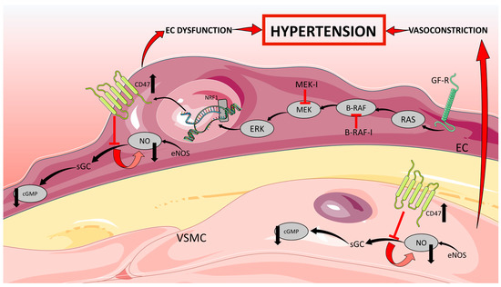 A possible mechanism for BRAF- and MEK-inhibitor-induced hypertension. EC: Endothelial cell; VSMC: Vascular smooth muscle cell; BRAF-I: BRAF-inhibitor; MEK-I: MEK-inhibitor; RAS: NRF1: Nuclear respiratory factor 1; eNOS: Endothelial NO synthase; NO; Nitric oxide; cGC: Soluble guanylate cyclase; cGMP: Cyclic guanosine monophosphate; CD47: Cluster of differentiation 47. Modified from [51]. Some elements of this figure were taken from the smart Servier Medical Art library (https://smart.servier.com/, accessed on 24 November 2022) published under the creative commons Attribution 3.0 Unported (CC BY 3.0) license (https://creativecommons.org/licenses/by/3.0/, accessed on 24 November 2022).