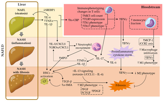Despite these findings, evidence was provided from diet-induced murine NASH models indicating that IFNγ- or Stimulator of interferon genes (STING)-deficiency attenuates steatosis and liver fibrosis, as well as TNFα and IL-6 mRNA liver expression [124,125]. These contradictory findings could have been reliant on inherent differences in NASH-induced mice models and on the difficulty to simulate human-like NASH in this species.