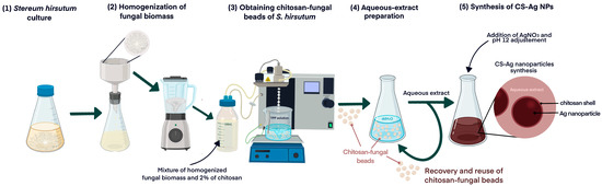 In a previous investigation, we described the successful synthesis of Ag NPs using an aqueous extract of the mycelia of the fungus S. hirsutum (CCCT22.02) [17]. Building on these findings, the current study aims to evaluate the synthesis of nanoparticles by utilizing a consecutive series of aqueous extracts derived from chitosan fungal beads. These beads are composed of the mycelia of S. hirsutum encapsulated within chitosan, which serve as a reusable source of compounds involved in the synthesis. The methodology employed in this study is outlined in the diagram presented in Figure 1.
