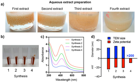 The dispersions of the fourth synthesis cycle had a flattened UV-vis spectrum with low absorbance at 420 nm. Until the third synthesis, no significant differences in the size (25–27 nm) or zeta potential (from −27 to −20 mV) of the nanoparticles were observed (Figure 3d). The nanoparticles obtained in the fourth synthesis showed a larger size of over 210 nm and a zeta potential of −10 mV.