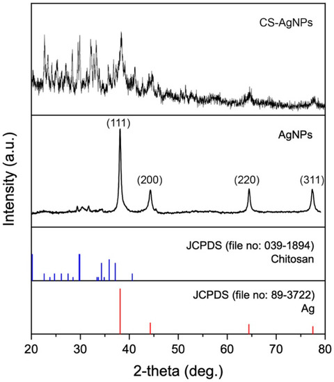 The XRD pattern of nanoparticles synthesized using the aqueous extract of chitosan fungal beads showed that they were composed of Ag0 and chitosan. This suggests that during the extract preparation using chitosan fungal beads, small amounts of chitosan can be released and stabilize the Ag NPs in the synthesis, resulting in the formation of chitosan-silver nanoparticles (CS-Ag NPs).