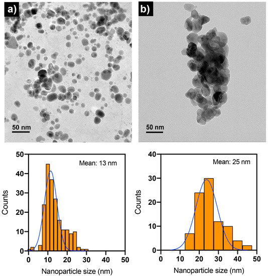 TEM images and nanoparticle size distribution histograms of Ag NPs (a) and CS-Ag NPs (b) synthesized using extracts of unencapsulated fungal biomass and chitosan-immobilized biomass of S. hirsutum, respectively. The “as-synthesized” nanoparticle suspensions were employed in TEM analysis with a pH near 10.