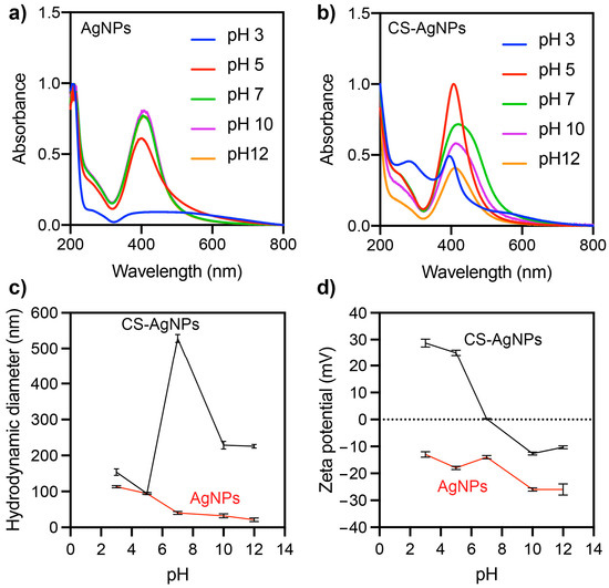 Effect of pH on the UV-vis (a,b), hydrodynamic diameter (c), and zeta potential (d) of synthesized Ag NPs and CS-Ag NPs.