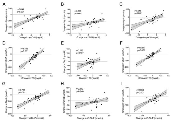 Correlation between change in 1H nuclear magnetic resonance (1H-NMR)—assessed glycoproteins (Glyc) and change in plasma concentrations of lipids, apolipoproteins (apo) and 1H-NMR—assessed lipoproteins. (A–C), Correlations between changes in Glyc concentrations and changes in apoC-III plasma concentrations. (D–F), Correlations between changes in Glyc concentrations and changes in plasma triglycerides (TG). (G–I), Correlations between changes in Glyc concentrations and changes in VLDL particle concentrations (VLDL-P). Lines represent linear regression with 95% CI.