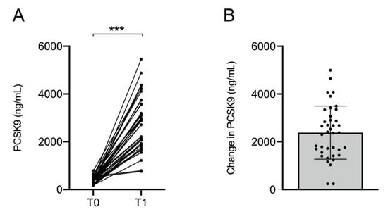 Circulating PCSK9 concentrations before and after PCSK9 inhibition therapy. (A) Individual patient data and (B) mean change in PCSK9 concentration. Error bars indicate SD. *** p < 0.001.