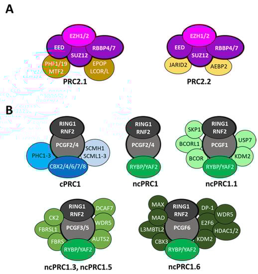 The mammalian Polycomb repressive complexes. (A) PRC2 is composed of four core subunits, EZH1/2, EED, SUZ12 and RBBP4/7, and is classified as two distinct complexes, PRC2.1 and PRC2.2 based on the auxiliary proteins associated. (B) The core PRC1 complex is composed of RING1 or RNF2 associated with one of the six PCGF proteins. Canonical PRC1 (cPRC1) includes PCGF2 or BMI1 (PCGF4), one of the chromobox proteins (CBX2, CBX4, CBX6-8), a polyhomeotic protein (PHC1/2/3) and eventually an SCM protein (SCMH1 or SCML1/2/3). In contrast, non-canonical PRC1 (ncPRC1) can include all PCGF proteins (PCGF1/2/3/4/5/6) associated with RYBP or YAF2. The identity of the PCGF subunit imposes the nature of the auxiliary proteins present in the assembly, thus defining diverse distinct ncPRC1 complexes.