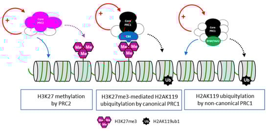 - Chan, H.L.; Morey, L. Emerging Roles for Polycomb-Group Proteins in Stem Cells and Cancer. Trends Biochem. Sci. 2019, 44, 688–700. [Google Scholar] [CrossRef] [PubMed]
