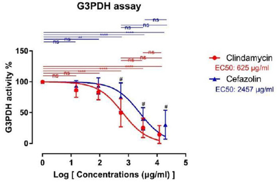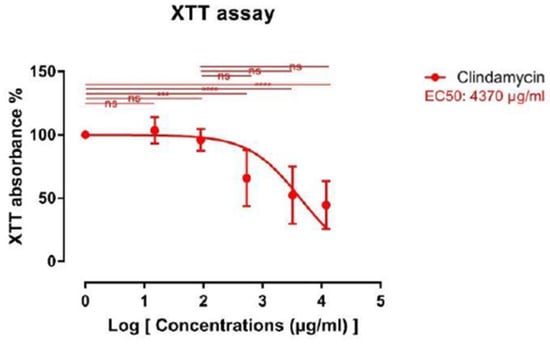 | Clindamycin phosphate (µg/mL) | 0 | 15 | 90 | 540 | 3240 | 12,000 |