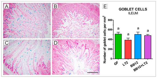 Goblet cells (blue color) in the ileum of gnotobiotic piglets. Number of goblet cells per mm2 in the ileum of the one-week-old piglets: germ-free (GF; (A)), infected with S. Typhimurium LT2 for 24 h (LT2; (B)), associated with B. animalis subsp. lactis BB-12 (BB12; (C)), and associated with BB12 and infected with LT2 for 24 h (BB12 + LT2; (D)). Six samples from each group were analyzed, and statistical differences were calculated by a two-way ANOVA with Tukey’s multiple comparison post hoc test. The values are presented as mean + SEM, and p < 0.05 among groups are denoted by different letters above the columns (E). A scale bar (D) depicts 200 μm.