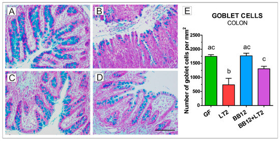 Goblet cells (blue color) in the colon of gnotobiotic piglets. Number of goblet cells per mm2 in the colon of the one-week-old gnotobiotic piglets: germ-free (GF; (A)), infected with S. Typhimurium LT2 for 24 h (LT2; (B)), associated with B. animalis subsp. lactis BB-12 (BB12; (C)), and associated with BB12 and infected with LT2 for 24 h (BB12 + LT2; (D)). Six samples from each group were analyzed, and statistical differences were calculated by a two-way ANOVA with Tukey’s multiple comparison post hoc test. The values are presented as mean + SEM, and a p < 0.05 among groups is denoted by different letters above the columns (E). A scale bar (D) depicts 100 μm.