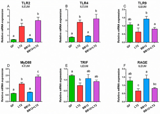 Relative expression (fold-change) of TLR2 (A), TLR4 (B), TLR9 (C), MyD88 (D), TRIF (E), and RAGE (F) mRNA in the ileum of the one-week-old gnotobiotic piglets: germ-free (GF), infected with S. Typhimurium LT2 for 24 h (LT2), associated with B. animalis subsp. lactis BB-12 (BB12), and associated with BB12 and infected with LT2 for 24 h (BB12 + LT2). Six samples from each group were analyzed, and statistical differences were calculated by a two-way ANOVA with Tukey’s multiple comparison post hoc test. The values are presented as mean + SEM, and a p < 0.05 among groups is denoted by different letters above the columns.