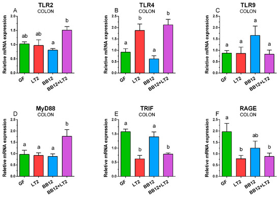 Relative expression (fold-change) of TLR2 (A), TLR4 (B), TLR9 (C), MyD88 (D), TRIF (E), and RAGE (F) mRNA in the colon of the one-week-old gnotobiotic piglets: germ-free (GF), infected with S. Typhimurium LT2 for 24 h (LT2), associated with B. animalis subsp. lactis BB-12 (BB12), and associated with BB12 and infected with LT2 for 24 h (BB12 + LT2). Six samples from each group were analyzed, and statistical differences were calculated by a two-way ANOVA with Tukey’s multiple comparison post hoc test. The values are presented as mean + SEM, and a p < 0.05 among groups is denoted by different letters above the columns.
