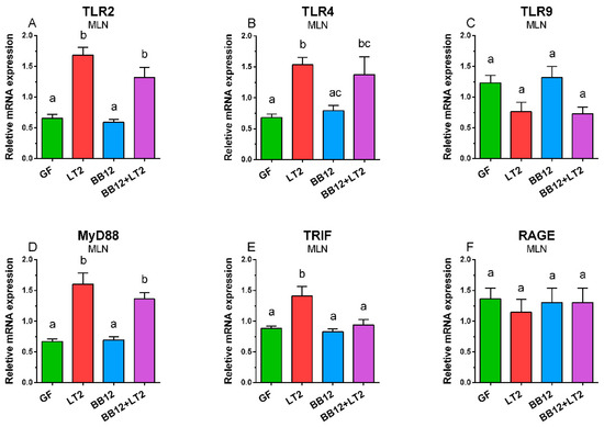 Relative expression (fold-change) of TLR2 (A), TLR4 (B), TLR9 (C), MyD88 (D), TRIF (E), and RAGE (F) mRNA in the mesenteric lymph nodes of the one-week-old piglets: germ-free (GF), infected with S. Typhimurium LT2 for 24 h (LT2), associated with B. animalis subsp. lactis BB-12 (BB12), and associated with BB12 and infected with LT2 for 24 h (BB12 + LT2). Six samples from each group were analyzed, and statistical differences were calculated by a two-way ANOVA with Tukey’s multiple comparison post hoc test. The values are presented as mean + SEM, and a p < 0.05 among groups is denoted by different letters above the columns.