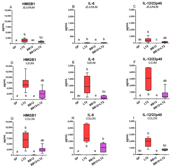 Abundance of HMGB1 (A,D,G), IL-6 (B,E,H), and IL-12/23p40 (C,F,I) proteins in the jejunum (A–C), ileum (D–F), and colon (G–I) of the one-week-old piglets: germ-free (GF), infected with S. Typhimurium LT2 for 24 h (LT2), associated with B. animalis subsp. lactis BB-12 (BB12), and associated with BB12 and infected with LT2 for 24 h (BB12 + LT2). Six samples from each group were analyzed, and statistical differences were calculated by the Kruskal–Wallis test with Dunn’s multiple comparison post hoc test. The values are presented as boxes and whiskers indicating the lower and upper quartiles, the central line is the median, and the ends of the whiskers depict the minimal and maximal values. A p < 0.05 among groups is denoted with different letters around the columns.