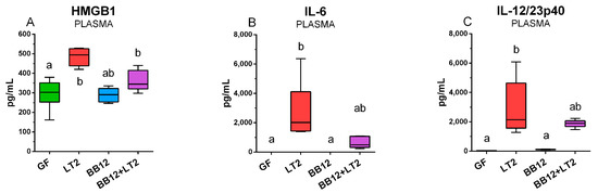 Plasma concentrations of HMGB1 (A), IL-6 (B) and IL-12/23p40 (C) proteins of one-week-old piglets: germ-free (GF), infected with S. Typhimurium LT2 for 24 h (LT2), associated with B. animalis subsp. lactis BB12 (BB12), and associated with BB12 and infected with LT2 for 24 h (BB12 + LT2). Six samples in each group were analyzed and statistical differences were calculated by the Kruskal–Wallis test with Dunn’s multiple comparison post hoc test. The values are presented as boxes and whiskers indicating the lower and upper quartiles, the central line is the median, and the ends of the whiskers depict the minimal and maximal values. A p < 0.05 among groups is denoted with different letters around the columns.