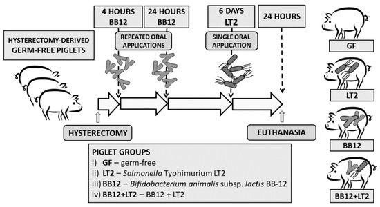 Preterm miniature germ-free (GF) piglets were derived by hysterectomy on day 104 of pregnancy and reared in fiberglass isolators with a partially heated floor; they were fed 6–7 times per day with cow-milk-based formula. Their microbiological state was tested as described elsewhere [29]. Piglets (n = 24) were divided into four groups, with six piglets per group (Figure 9), and orally colonized/infected with BB12 (BB12), LT2 (LT2), and their combination (BB12 + LT2), as we showed (Figure 9) and described previously [46]. The bacteria were orally administered in 5 mL of the milk diet, and the control piglets (GF) received 5 mL of milk without bacteria. At the end of the experiment, the piglets were euthanized by exsanguination via cardiac puncture under isoflurane anesthesia.