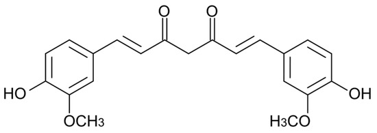 This lipophilic polyphenol, with a chemical formula of C21H20O6 and a molecular weight of 368.38 g/mol, is a dimeric derivative of ferulic acid, composed of two o-methoxyphenol rings connected by a heptadienedione chain [27] (Figure 1). Curcumin is the principal bioactive compound of turmeric powder, which together with other essential oils and curcuminoids is contained in the oriental spice commonly obtained from this plant [38,39].