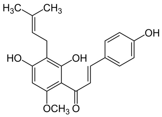 Another similar substance, also known since ancient times, is xanthohumol, a derivative from the female flowers of the hops plant (Humulus lupulus L), which is a prenylated flavonoid (Figure 2) with potential antiseptic, anti-inflammatory, antidiuretic and antioxidant properties [40]. In 2013, the antibiofilm activity of hop-derived compounds was first published by Rozalski et al. [40].
