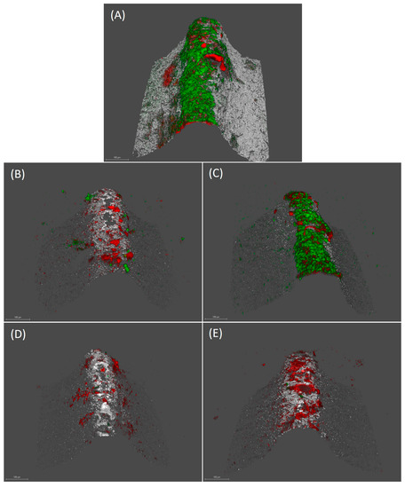 Images obtained by confocal laser scanning microscopy (CLSM) at 72 h over implants treated with phosphate buffer saline (PBS) (A), 0.2% chlorhexidine (CHX) (B), 2.5% dimethyl sulfoxide (DMSO) (C), µM xanthohumol 100 (D) and 5 mM curcumin (E) (scale bar = 100 µm). LIVE/DEAD® BackLight Kit was used. Live bacteria (green), dead bacteria (red) and implant surface (white) can be differentiated.