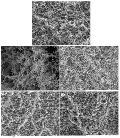 Images obtained by scanning electron microscope (SEM) with 2500× magnification of biofilm developed at 72 h over implants treated with phosphate buffer saline (PBS) (A), 0.2% chlorhexidine (CHX) (B), 2.5% dimethyl sulfoxide (DMSO) (C), 100 µM xanthohumol (D) and 5 mM curcumin (E) (scale bar = 20 µm).